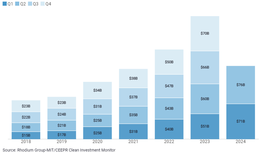 This time period also coincided with a mass mobilization and allocation of capital toward the energy and infrastructure transition.  In response to climate change, governments, corporations, technology companies, and financiers have taken significant action in recent years. US climate-focused investments totaled $247 billion in 2023, increasing 216% from $78 billion five years prior (Figure 2).